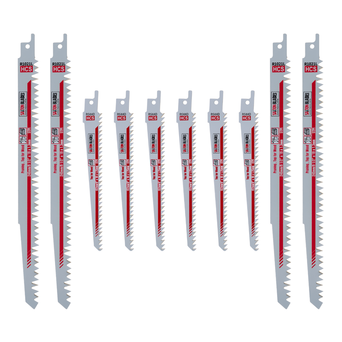 - [WOOD CUTTING & PRUNING BLADE SET] – Saxton 10-piece reciprocating saw blade combo designed for efficient wood cutting and pruning, covering both fast rough cuts and finer detailed work.