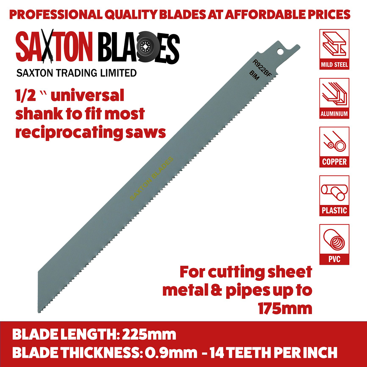 - [HIGH-SPEED CUTTING PERFORMANCE] - The Saxton R922BF reciprocating saw blade is expertly designed for rapid and efficient cutting of metal plates (3-8mm thick) and solid pipes/profiles with diameters ranging from 10 to 175mm. Ideal for both professional trades and DIY projects, this blade ensures precision and speed.