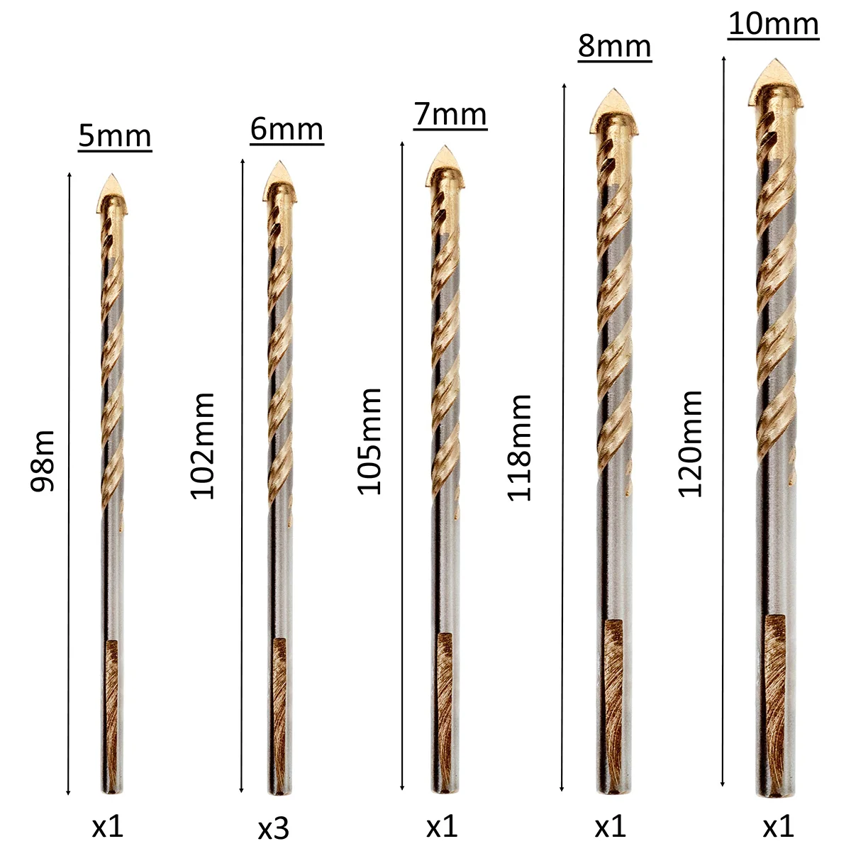 - The set includes: (1x) 5mm x 98mm, (3x) 6mm x 102mm, (1x) 7mm x 105mm, (1x) 8mm x 118mm, (1x) 10mm x 120mm