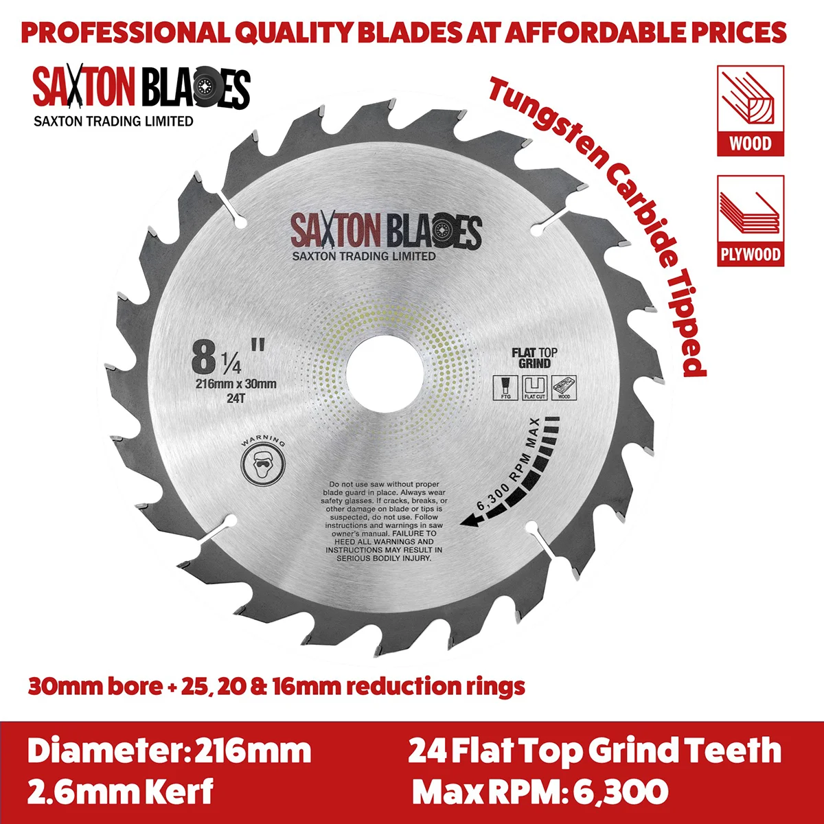 - [DIMENSIONS] - 216mm Diameter - 24 teeth - 30mm bore (16, 20 and 25mm reduction rings included) - 2.6mm Kerf (thickness of cut)