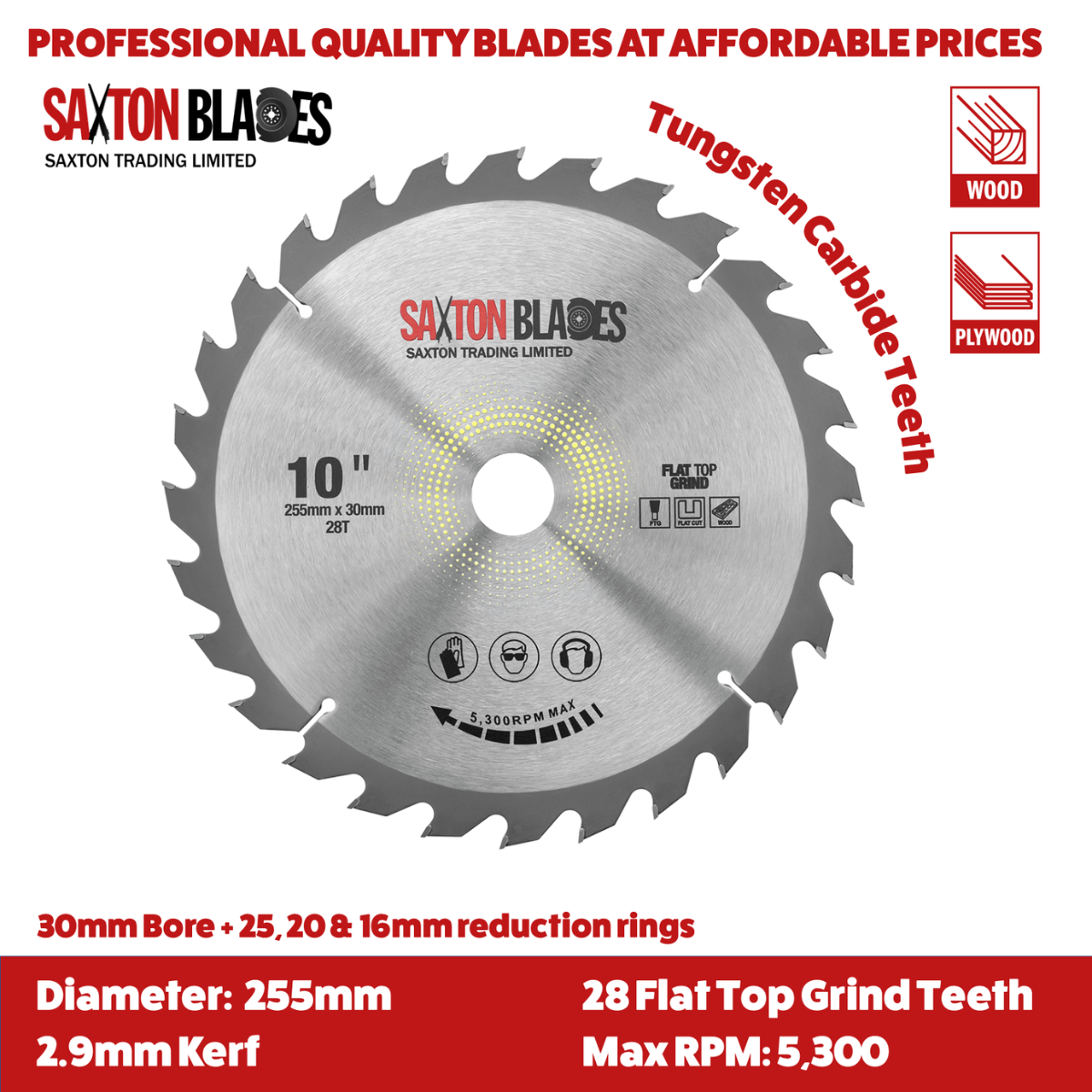 Flat Top Grind TCT Circular Saw Blade 255mm x 28T x 25.4mm Bore