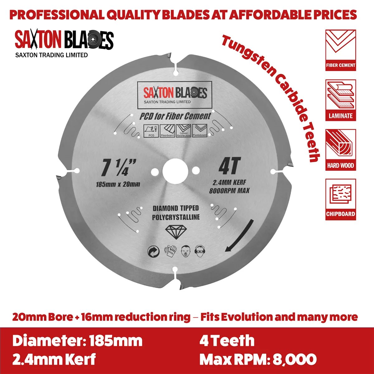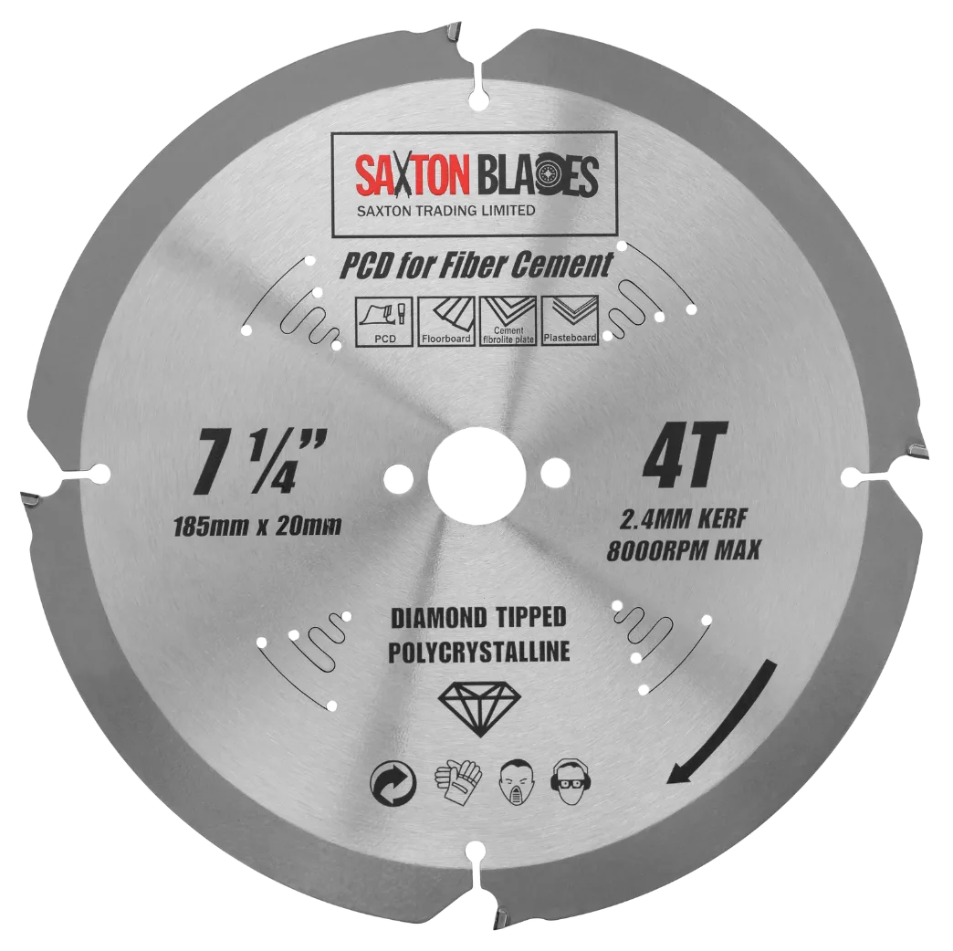 - [FEATURES] - Saxton PCD blades have a longer lifespan thanks to polycrystalline diamond (PCD) tips. The longer gullet on these PCD blades improves material removal while allowing for faster cutting and less dust