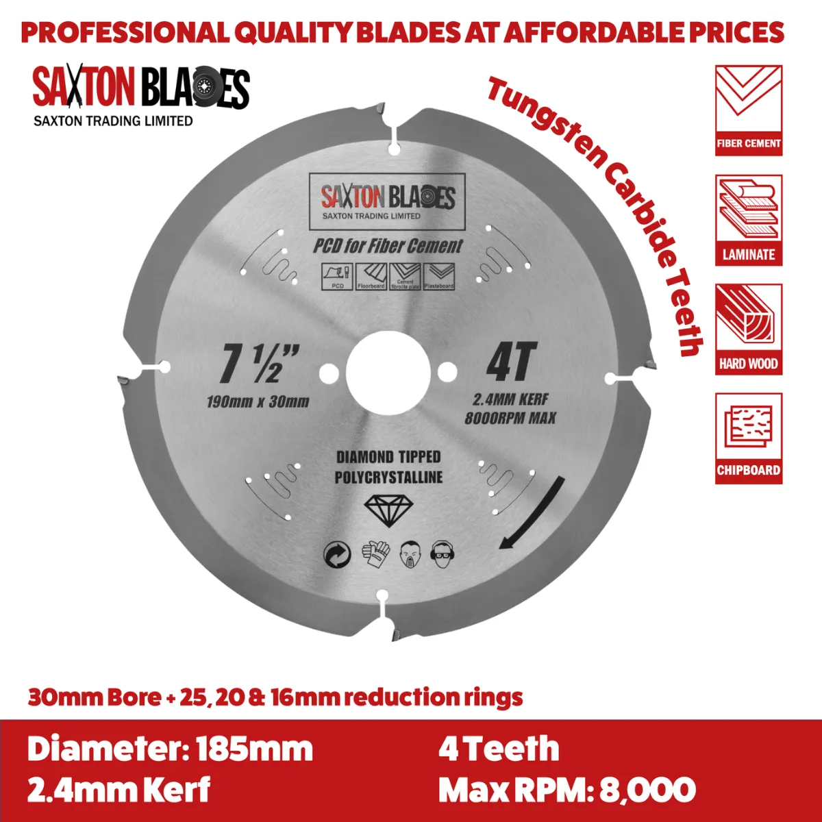 - [DIMENSIONS] - 190mm Diameter – 4 Polycrystalline Diamond Teeth - 30mm bore (16, 20 and 25mm reduction rings included) - 2.4mm Kerf (thickness of cut)