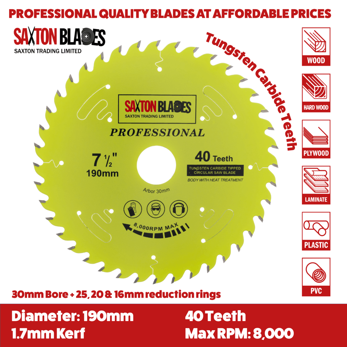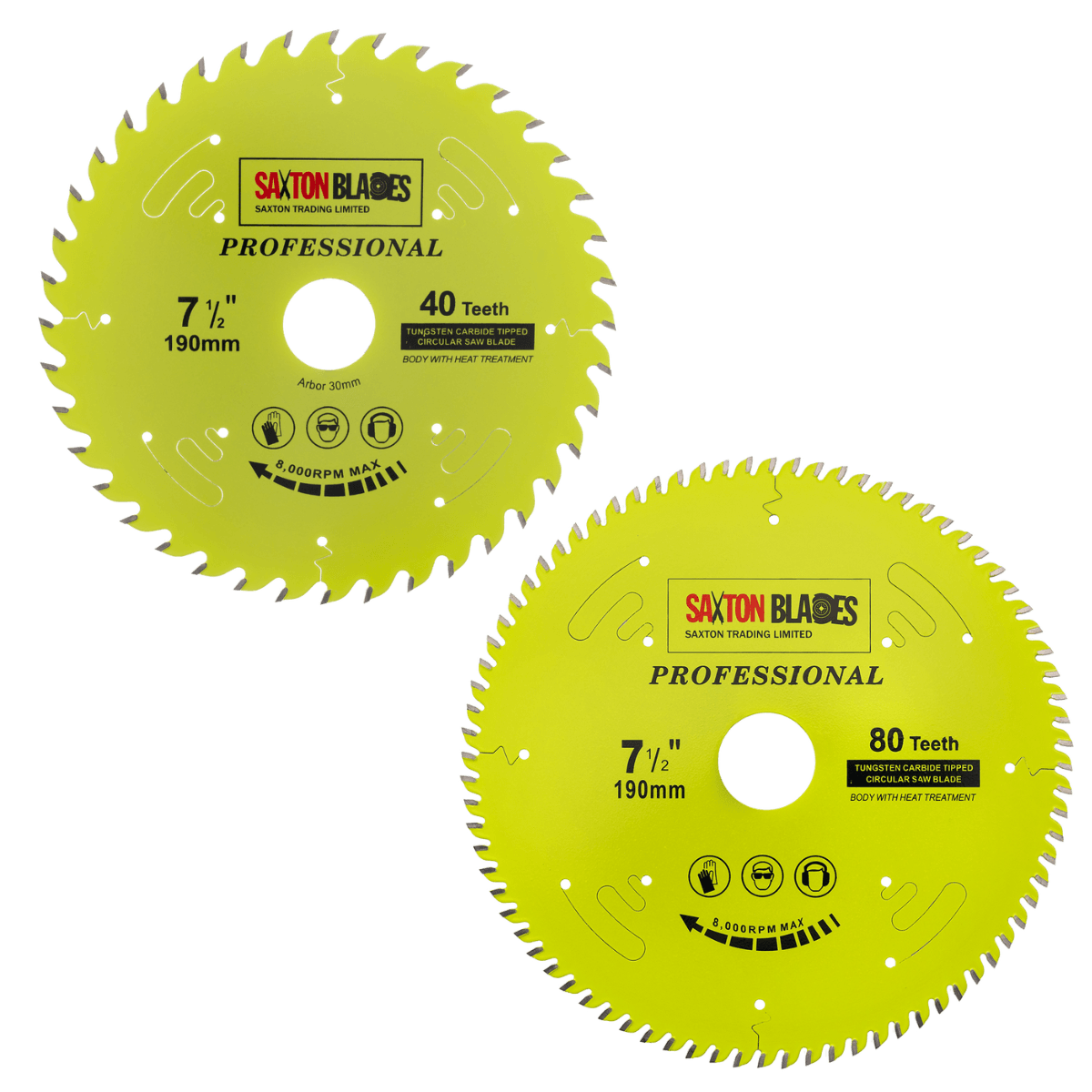 - [DIMENSIONS] - 190mm Diameter – 40 & 80 teeth - 30mm bore (16, 20 & 25mm reduction rings included) - 1.7mm Kerf (thickness of cut) – Pack of 2