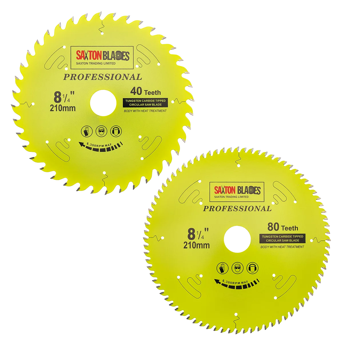 - [DIMENSIONS] - 210mm Diameter - 40 & 80 teeth - 30mm bore (16, 20, 25 & 25.4mm reduction rings included) - 2.3mm Kerf (thickness of cut) - Pack of 2