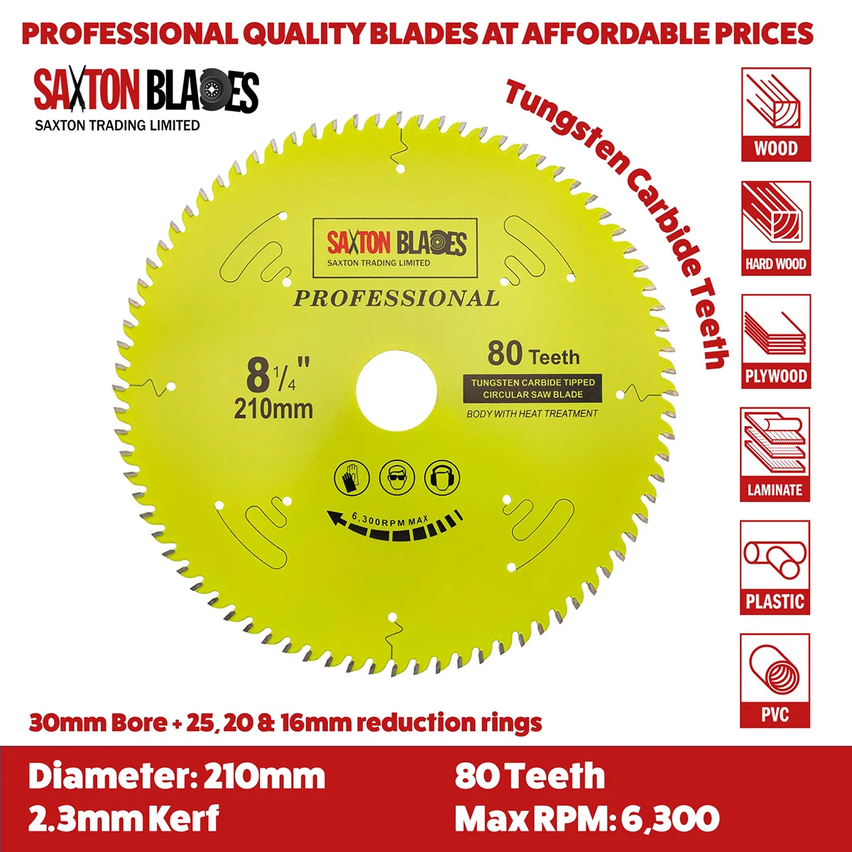 - Compatibility: Compatible with Evolution, Dewalt Bosch, Makita, Ryobi, and other circular saws utilising a 210mm blade with a 30, 25.4, 25, 20, or 16mm bore (reduction rings included)