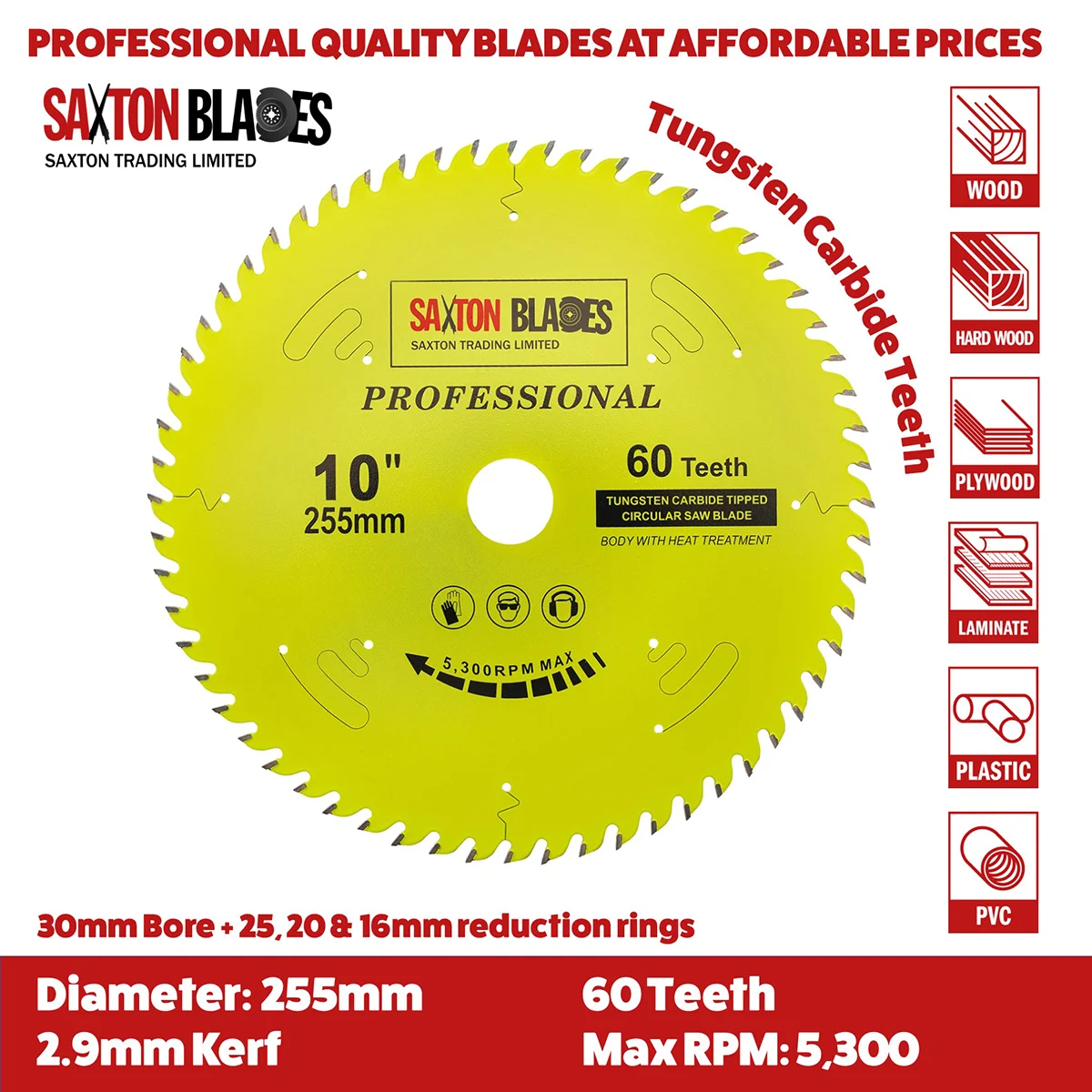 - [COMPATIBILITY] – Compatible with Evolution, Dewalt Bosch, Makita, Ryobi and any other circular saws which use a 250mm blade with a 30, 25.4, 25, 20 or 16mm bore (reduction rings included). Suitable for table saws, mitre/chop saws and handheld circular saws
