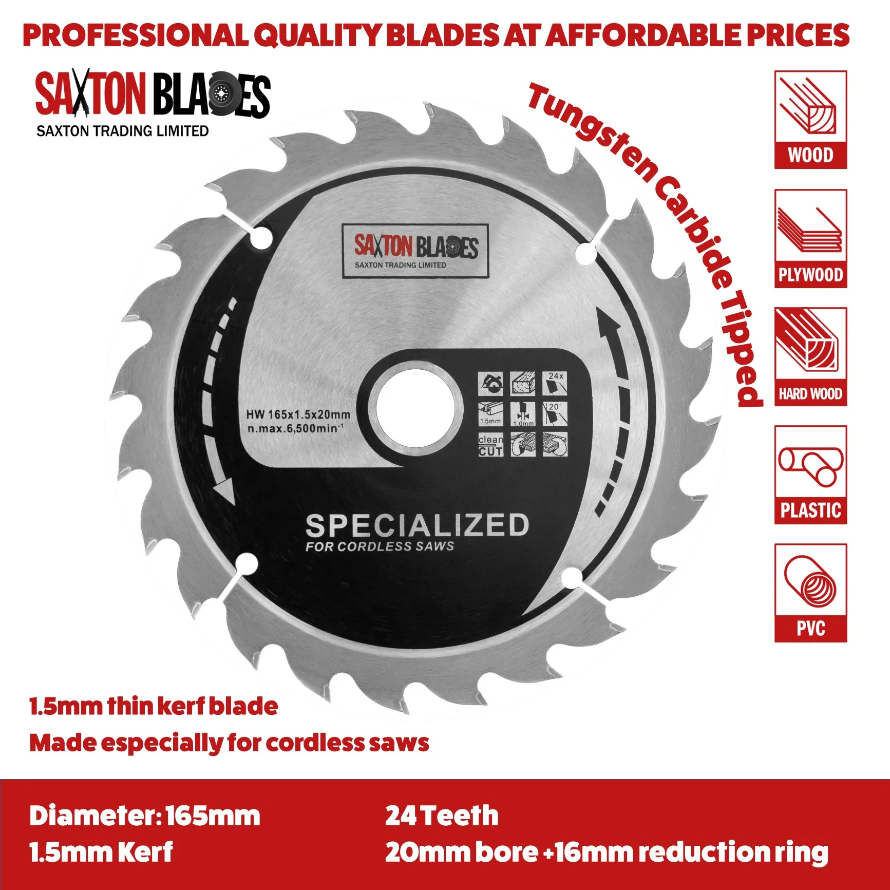 - [DIMENSIONS] - 165mm Diameter - 24 teeth - 20mm bore (16mm reduction ring included) - 1.5mm Kerf (thickness of cut) - Plate thickness: 1.0mm - Specialised thinner blade for cordless saws