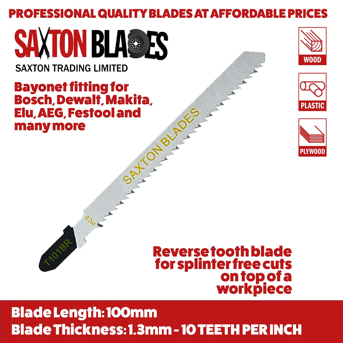 - [DESIGN] - Featuring a reverse tooth design, the T101BR blades are engineered to provide splinter-free cuts on the top surface of your workpiece, with a blade length of 100mm (including holder) and 10 teeth per inch (TPI).