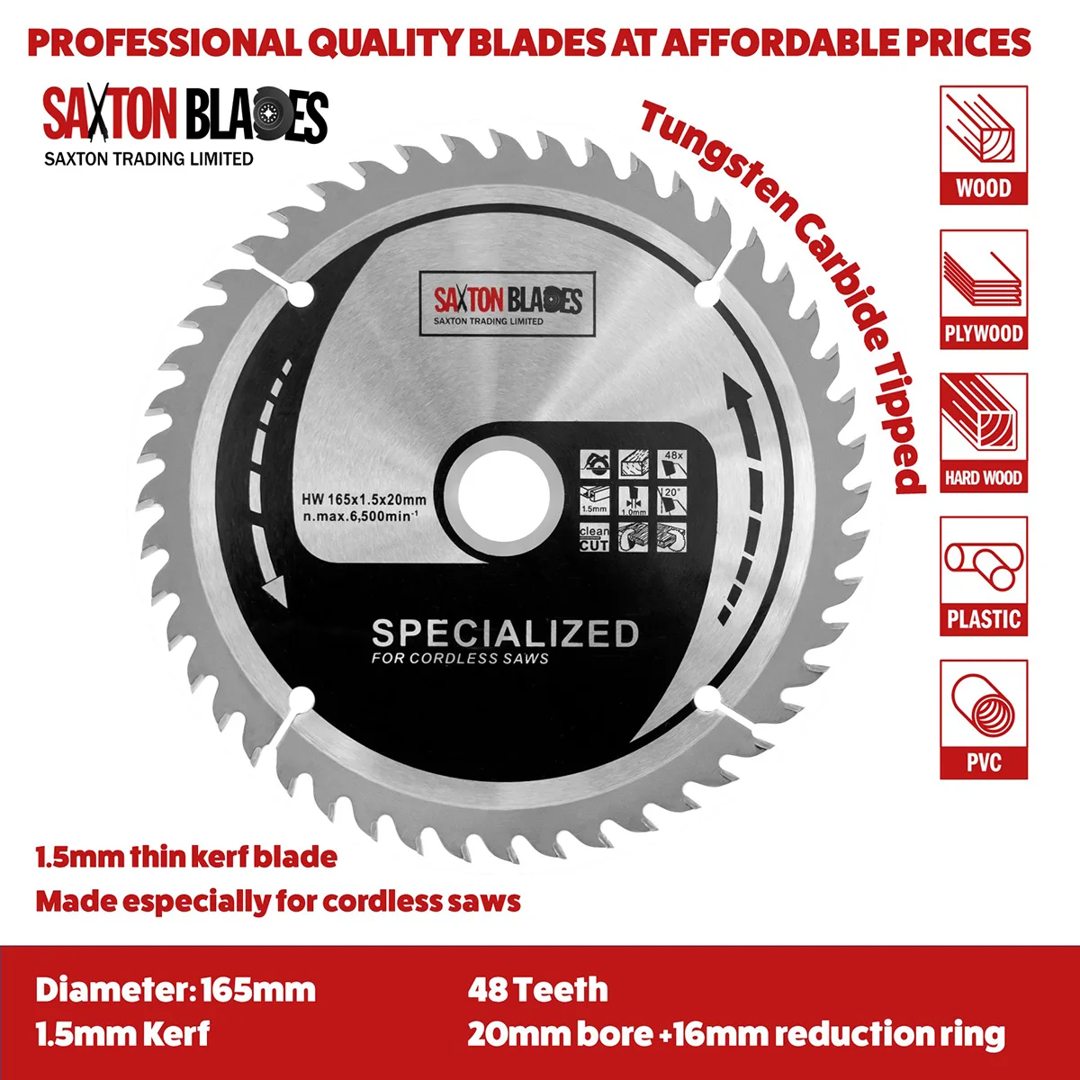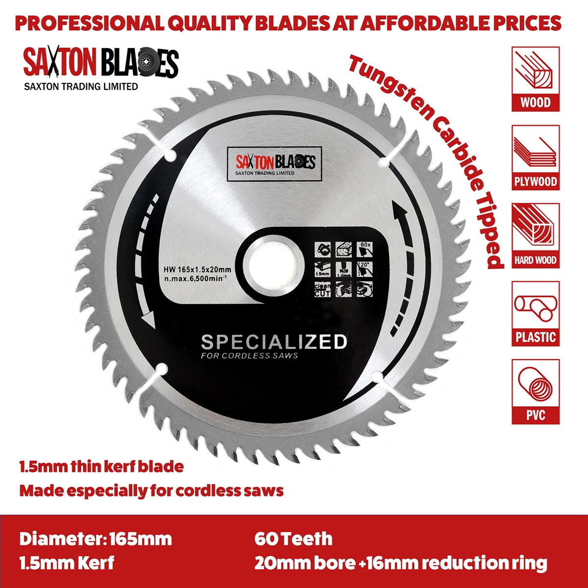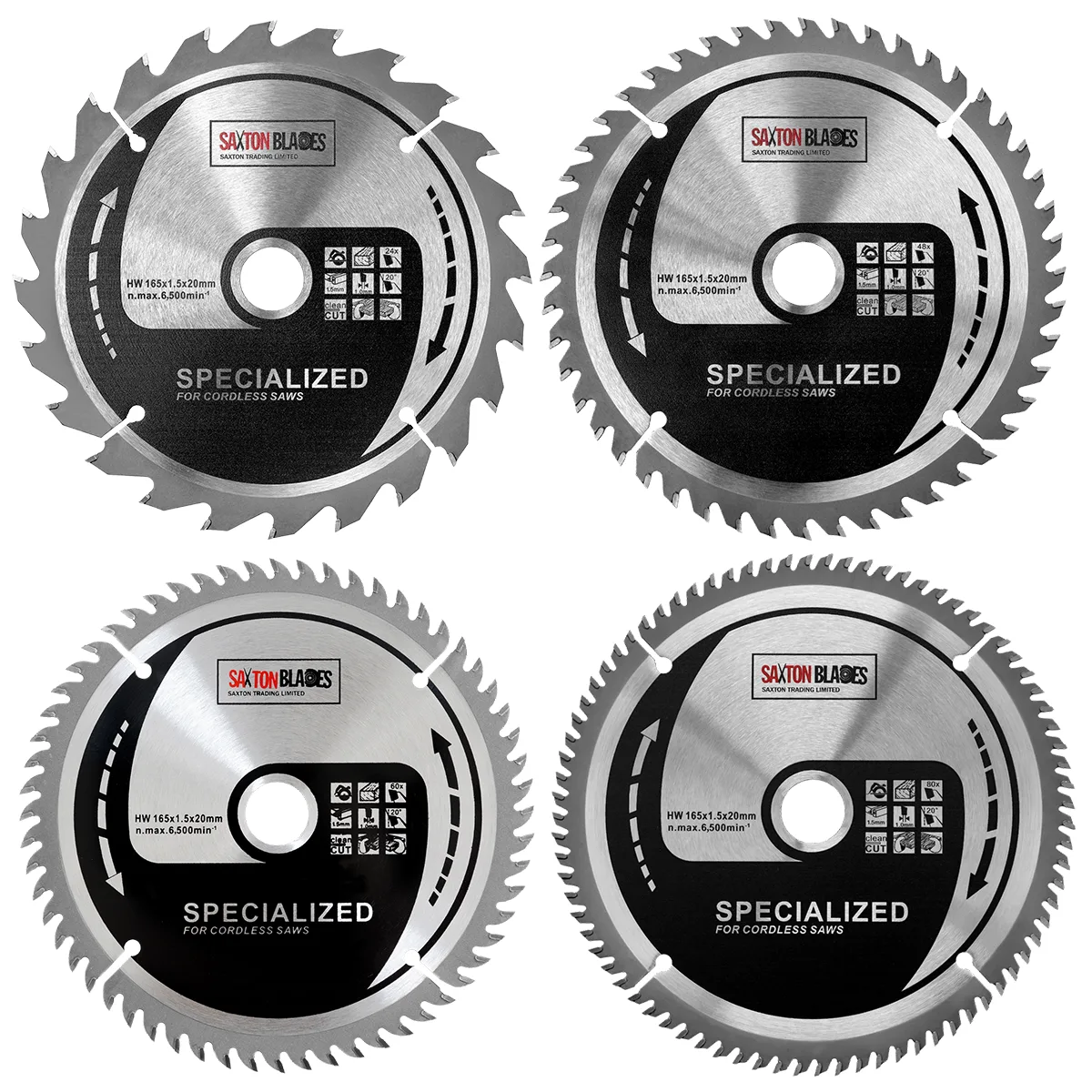 - [DIMENSIONS] - 165mm Diameter – 24, 48, 60 & 80 teeth - 20mm bore (16mm reduction ring included) – 1.5mm Kerf (thickness of cut) – Plate thickness: 1.0mm – Specialised thinner blade for cordless saws – Pack of 4