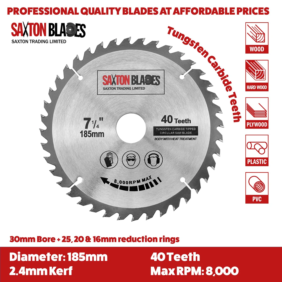 - [DIMENSIONS] – 185mm Diameter – 40 Teeth – 30mm Bore (16, 20 and 25mm reduction rings included) – 2.4mm Kerf (thickness of cut)