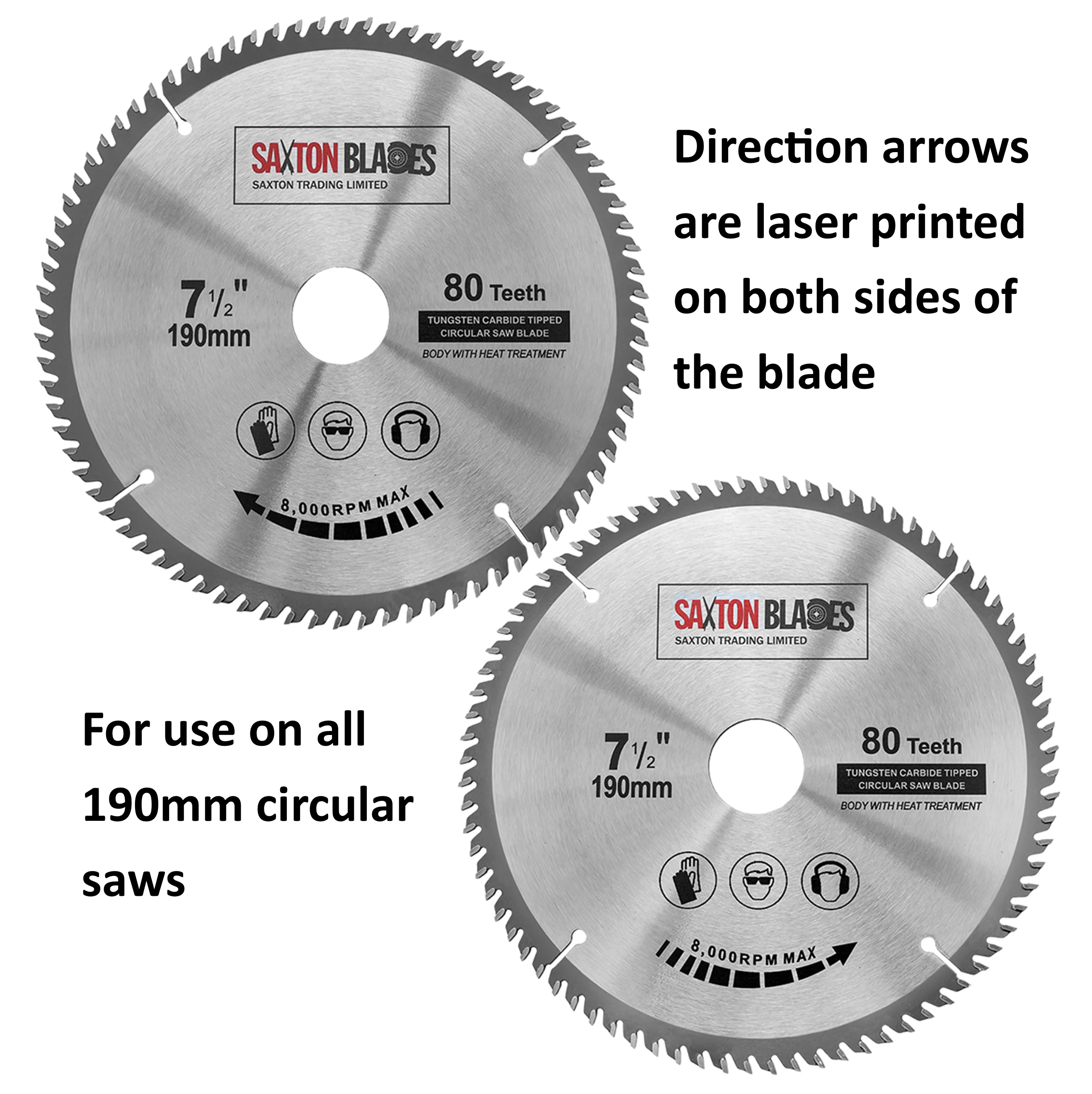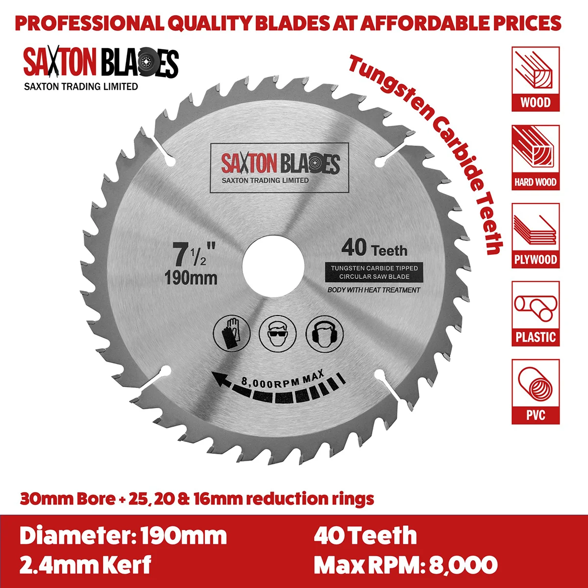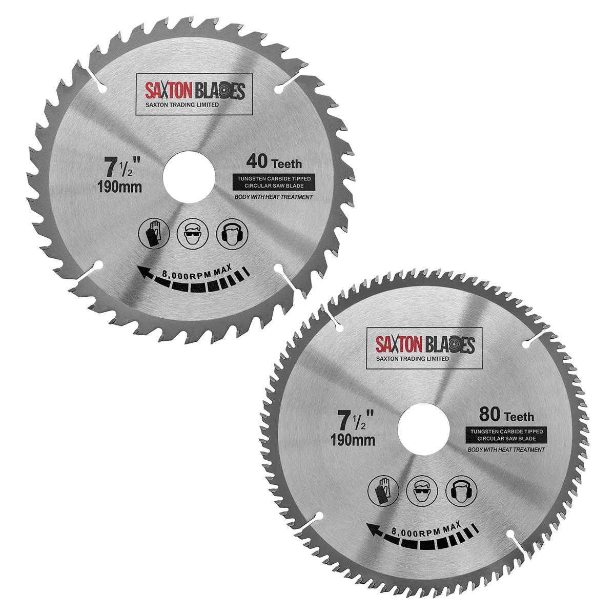 - [DIMENSIONS] - 190mm Diameter – 40 & 80 teeth - 30mm bore (16, 20 and 25mm reduction rings included) - 2.4mm Kerf (thickness of cut) - Pack of 2