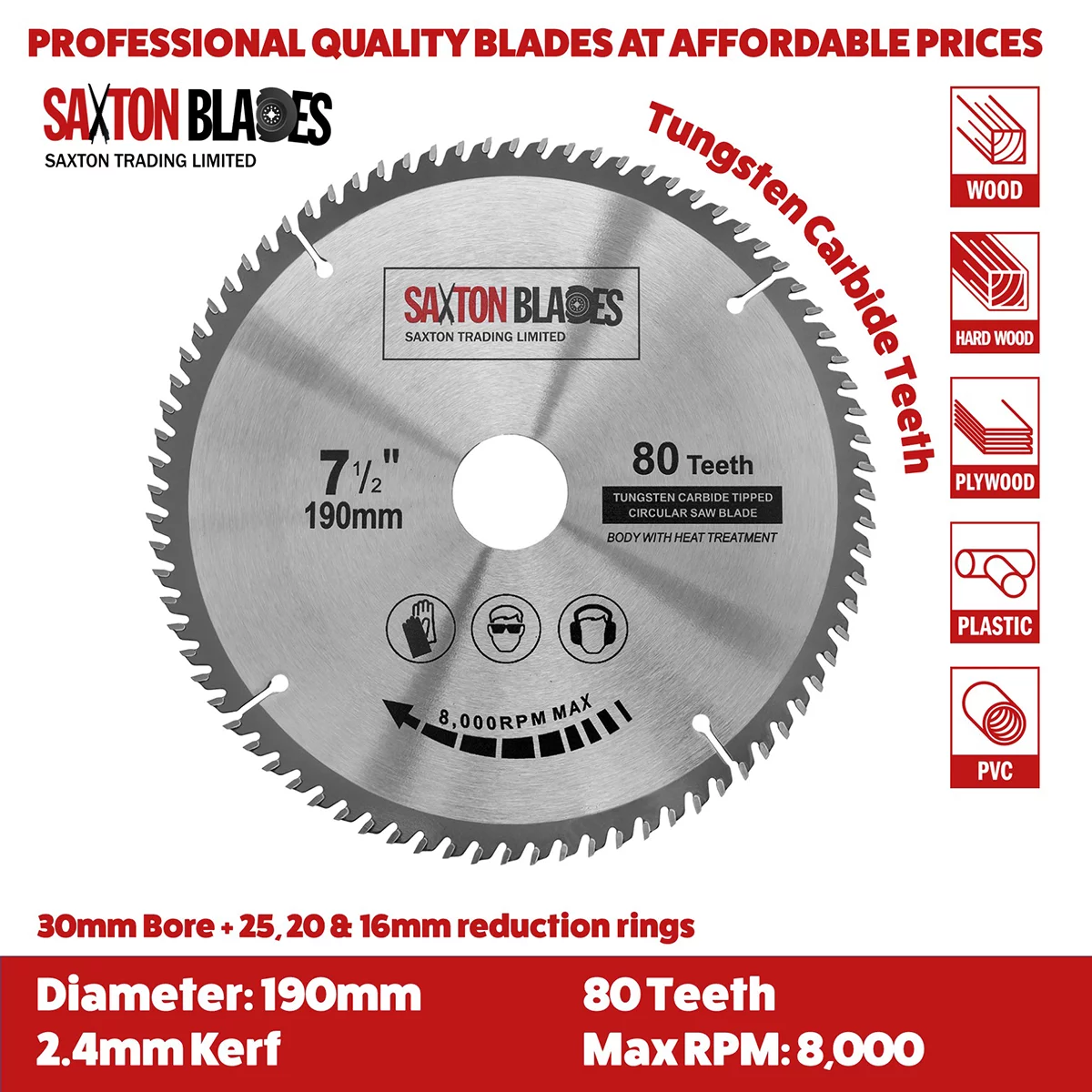 - [COMPATIBILITY] – Compatible with Dewalt, Bosch, Makita, Ryobi and any other circular saws which use a 190mm blade with a 30, 25, 20 or 16mm bore (reduction rings included) Suitable for table saws, mitre/chop saws and handheld circular saws