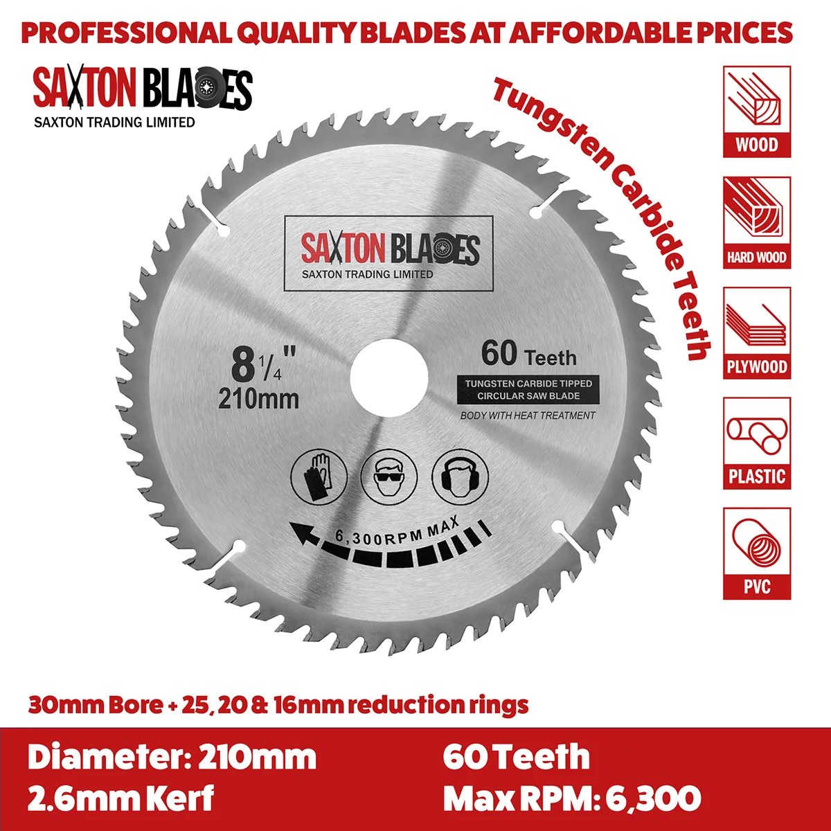 - [DIMENSIONS] - 210mm Diameter – 60 teeth - 30mm bore (16, 20 and 25mm reduction rings included) - 2.6mm Kerf (thickness of cut)