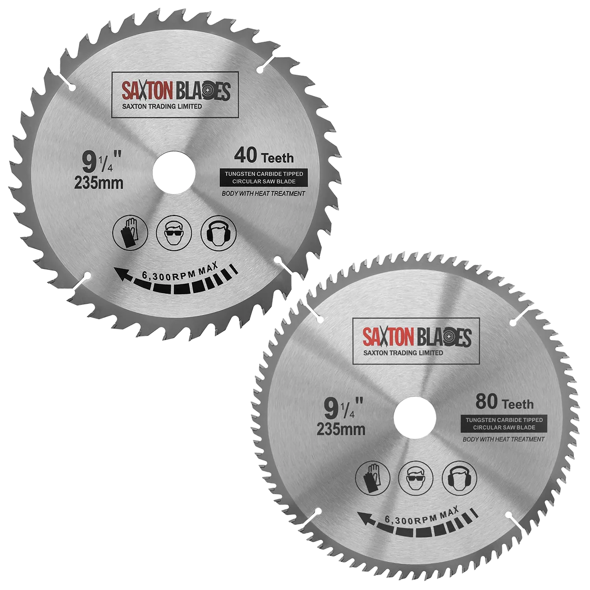 - [DIMENSIONS] - 235mm Diameter – 40 & 80 teeth - 30mm bore (16, 20 and 25mm reduction rings included) - 2.6mm Kerf (thickness of cut) – Pack of 2
