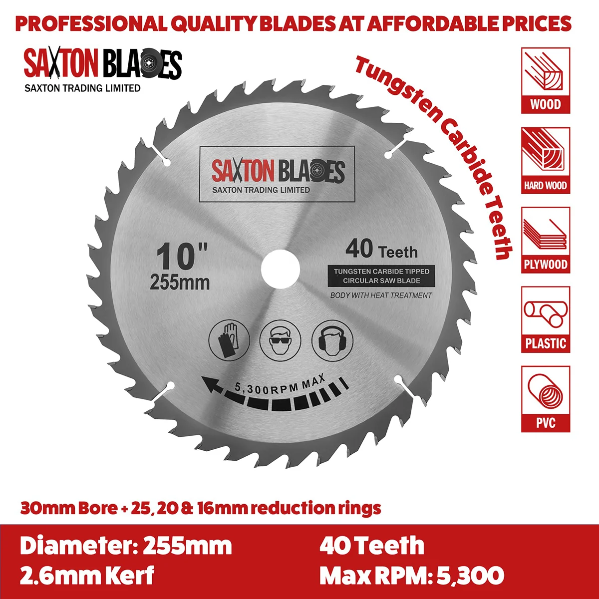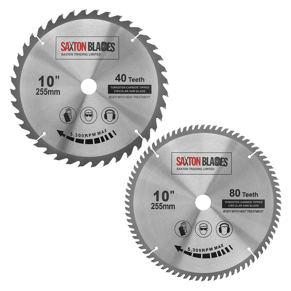 - [DIMENSIONS] - 255mm Diameter – 40 & 80 teeth - 30mm bore (16, 20 and 25mm reduction rings included) - 2.6mm Kerf (thickness of cut) – Pack of 2
