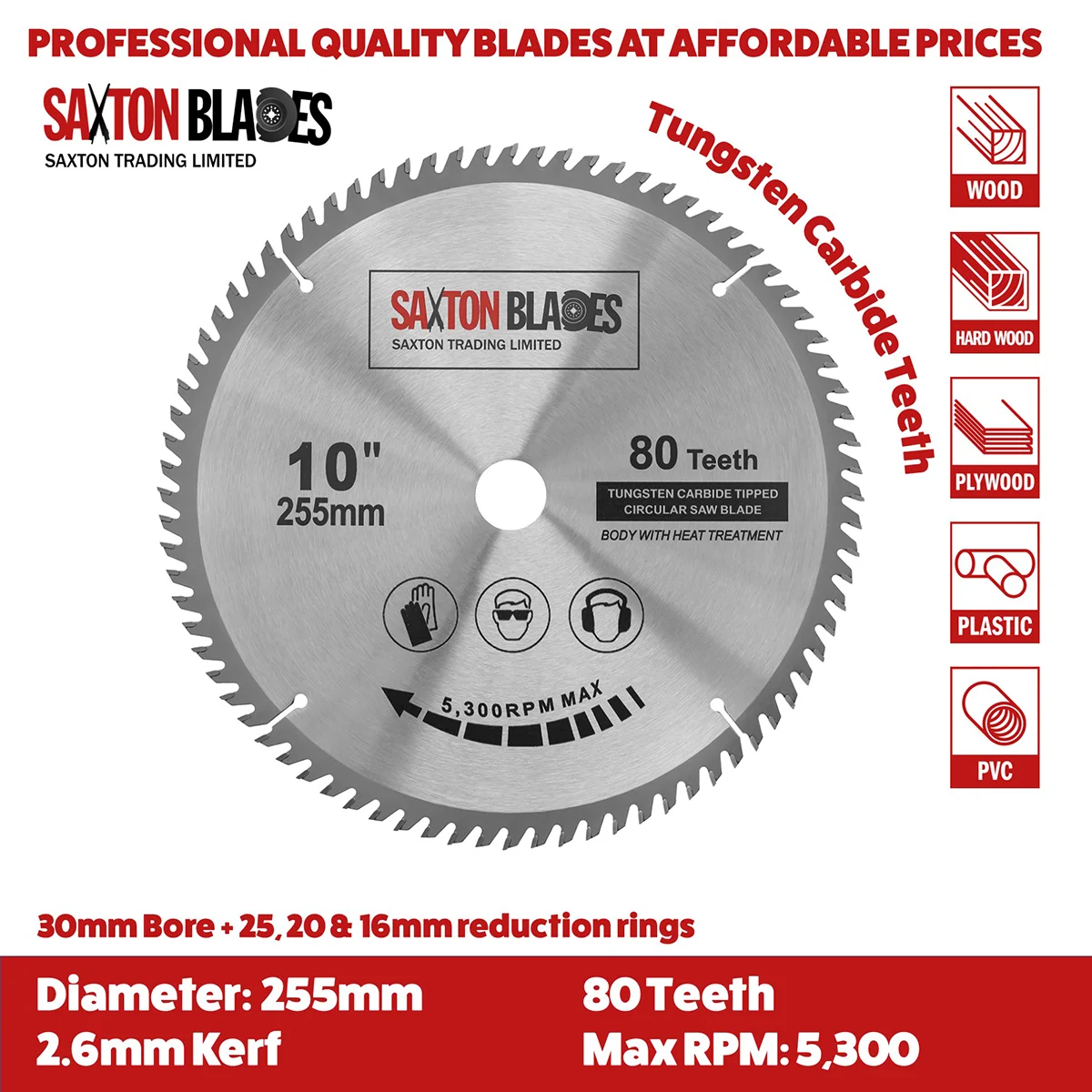 - [COMPATIBILITY] – Compatible with Dewalt, Bosch, Makita, Ryobi and any other circular saws which use a 255mm blade with a 30, 25, 20 or 16mm bore (reduction rings included). Suitable for table saws, mitre/chop saws and handheld circular saws
