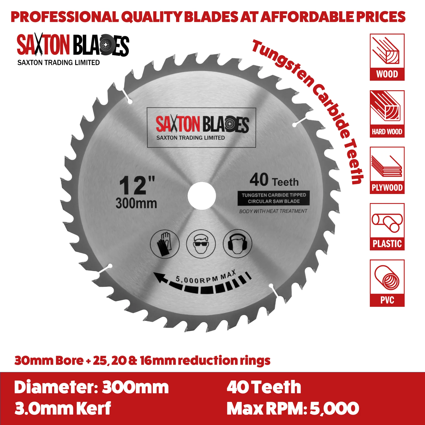 - [DIMENSIONS] - 300mm Diameter - 40 teeth - 30mm bore (16, 20 and 25mm reduction rings included) – 3.0mm Kerf (thickness of cut)