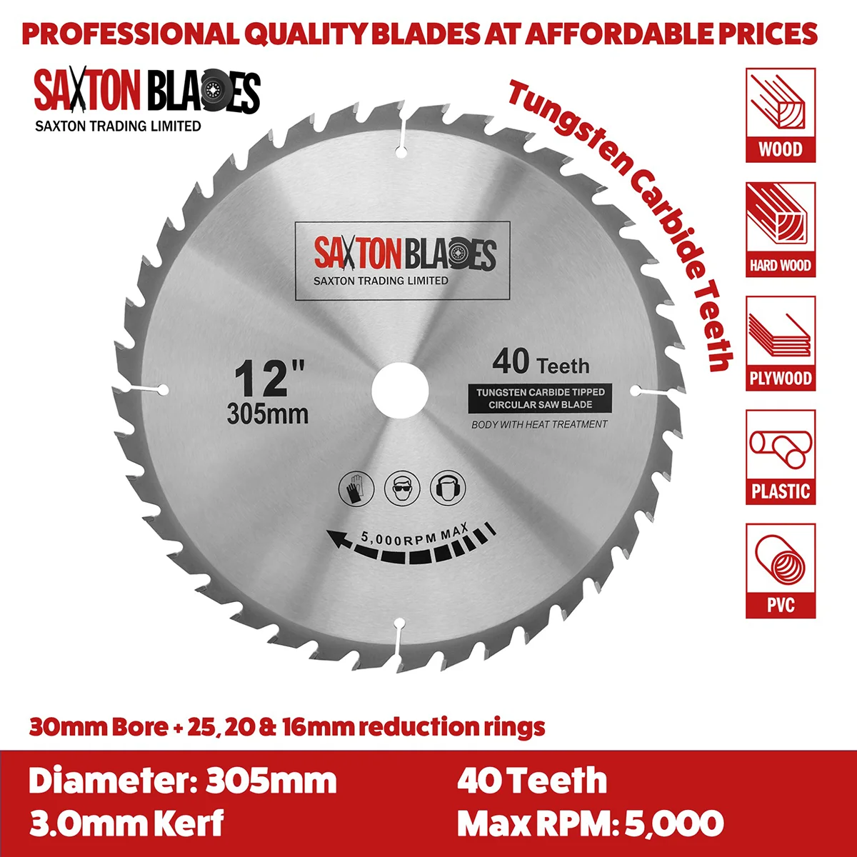 - [DIMENSIONS] - 305mm Diameter - 40 teeth - 30mm bore (16, 20 and 25mm reduction rings included) – 3.0mm Kerf (thickness of cut)