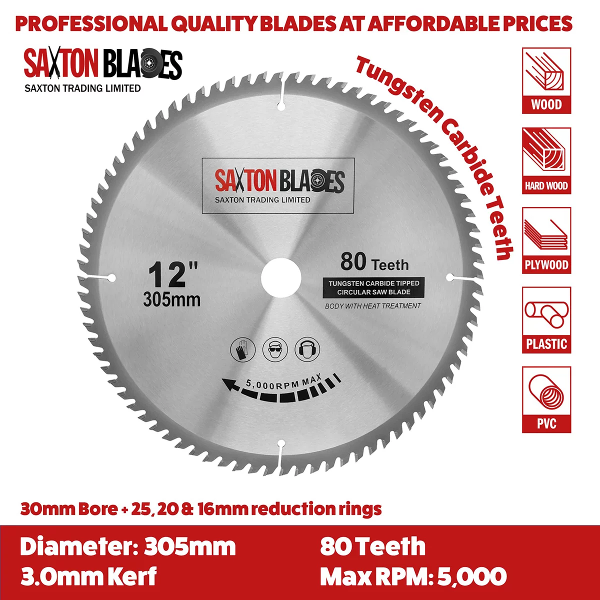 - [DIMENSIONS] - 305mm Diameter - 80 teeth - 30mm bore (16, 20 and 25mm reduction rings included) – 3.0mm Kerf (thickness of cut)