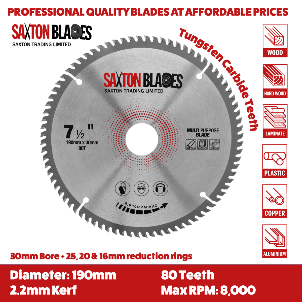 - [DIMENSIONS] - 190mm Diameter - 80 teeth - 30mm bore (reduction rings included) - 2.2mm Kerf (thickness of cut)