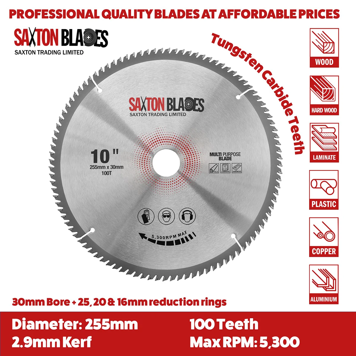 - [DIMENSIONS] - 255mm Diameter – 100 teeth – 30mm bore (16mm, 20mm & 25mm reduction rings included) – 2.9mm Kerf (thickness of cut)