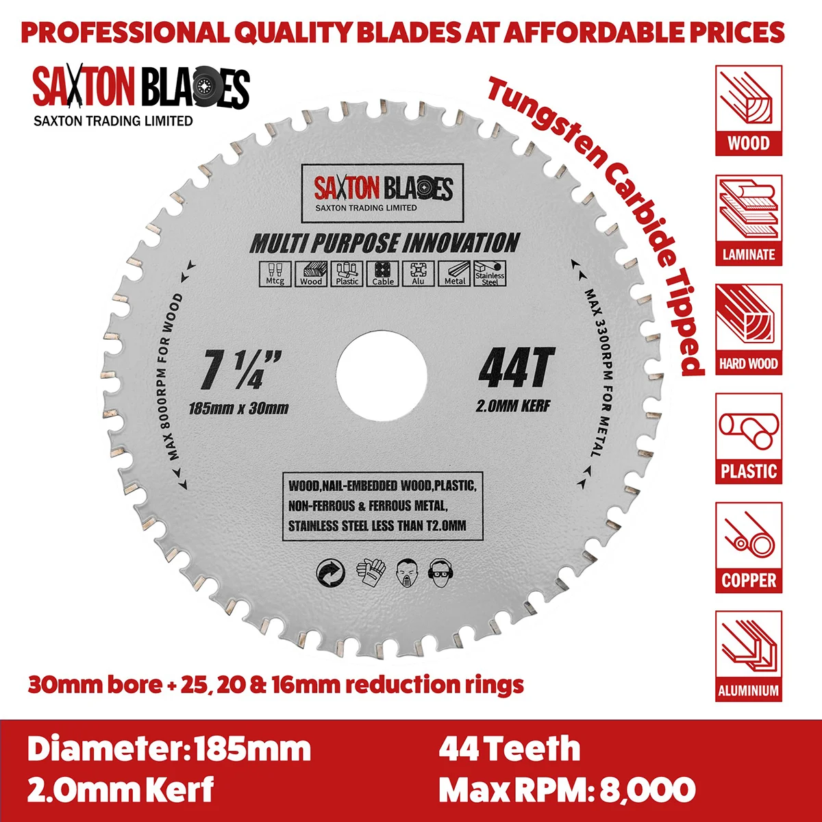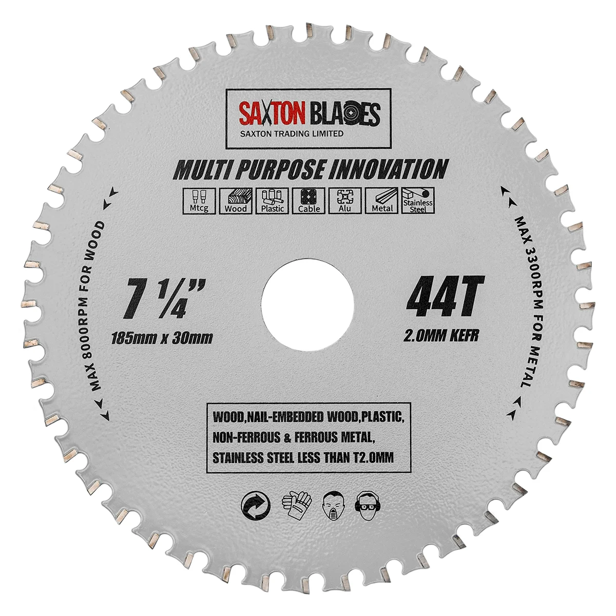 Dimensions - 185mm Diameter – 44 Teeth – 30mm Bore (reduction rings included) – 2.0mm Kerf SKU - TCT-MPI-CB-185X44T Applications - 185mm Diameter – 44 Teeth – 30mm Bore (reduction rings included) – 2.0mm Kerf Specifications -- Material: Fully hardened steel body with tungsten carbide teeth.