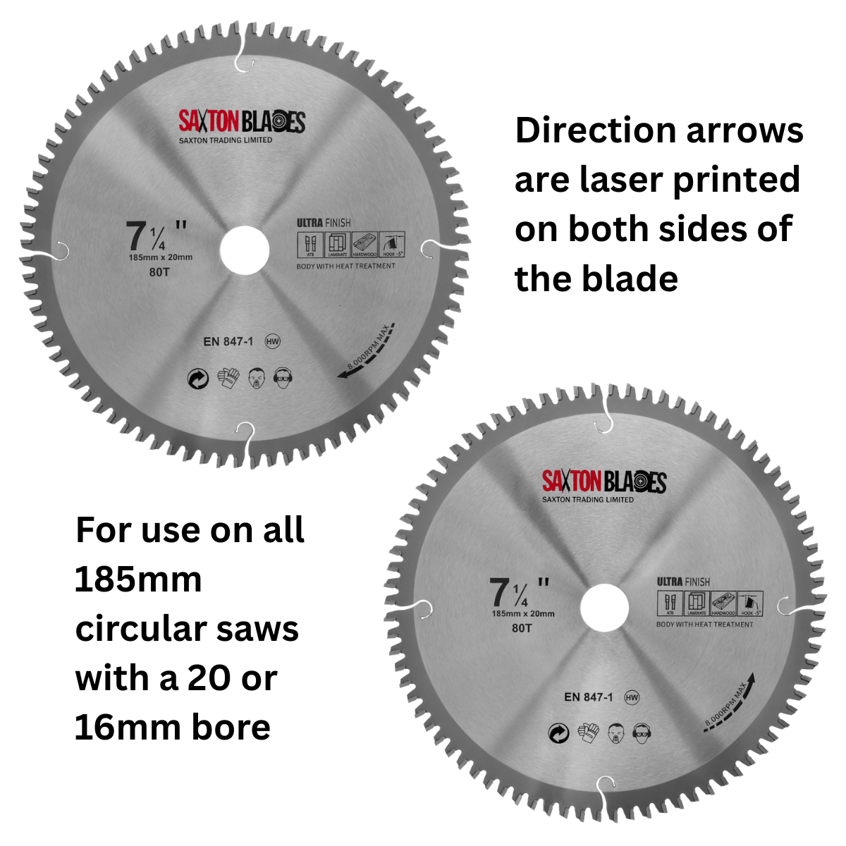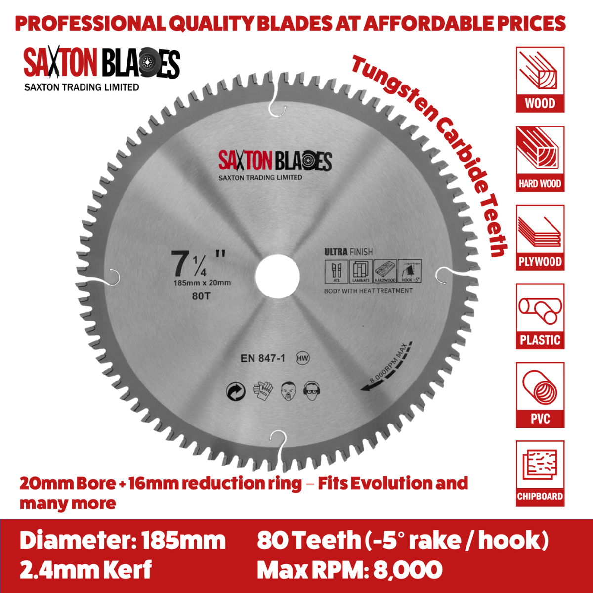 - [COMPATIBILITY] - Compatible with Evolution, DeWalt, Bosch, Makita, Ryobi, and other circular saws that use a 185mm blade with a 20mm or 16mm bore (16mm reduction ring included). Suitable for mitre/chop saws, table saws, handheld circular saws, and radial arm saws.