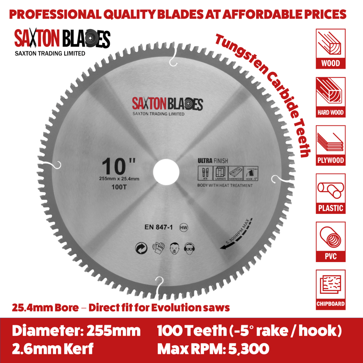 - [COMPATIBILITY] - Compatible with all Evolution 255mm saws that use a 25.4mm bore. Suitable for mitre/chop saws, table saws, handheld circular saws, and radial arm saws.