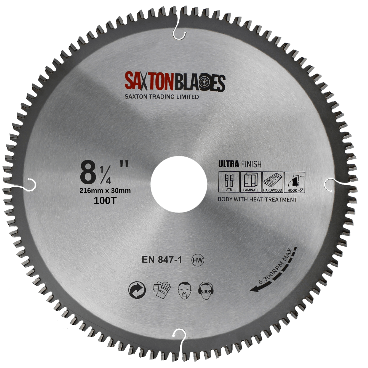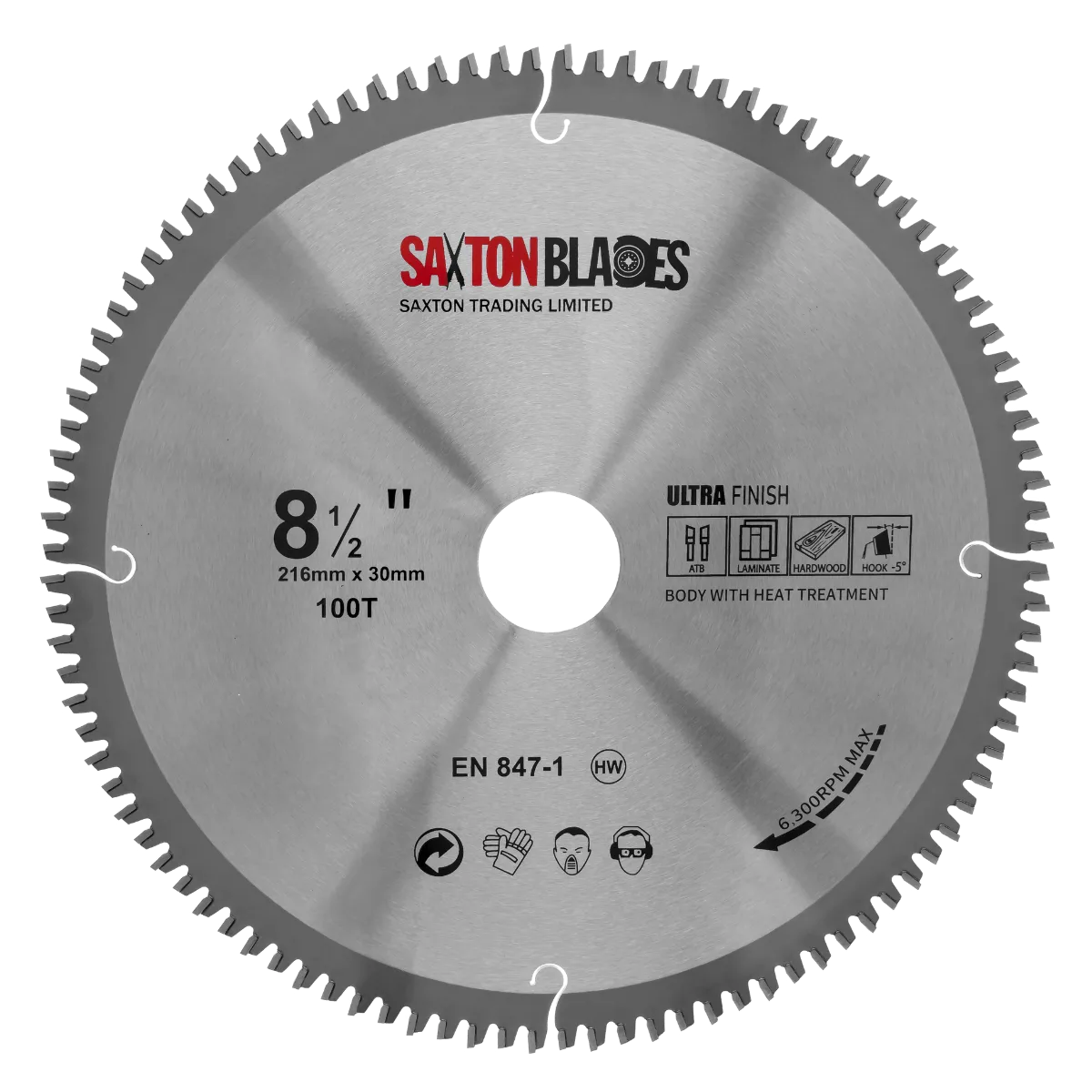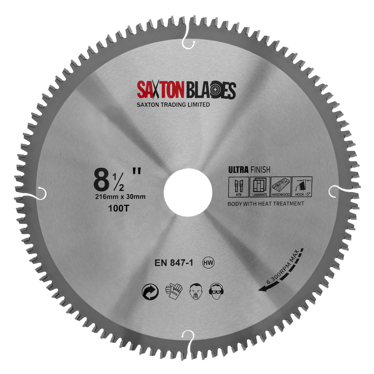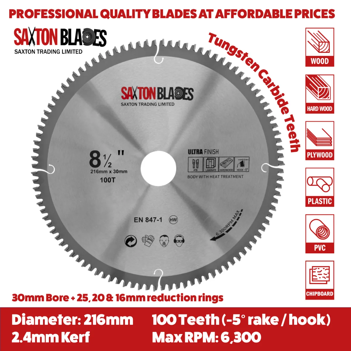 - [DIMENSIONS] - 216mm Diameter - 100 teeth (-5° rake / hook) - 30mm bore (16, 20, and 25mm reduction rings included) - 2.4mm Kerf (thickness of cut)