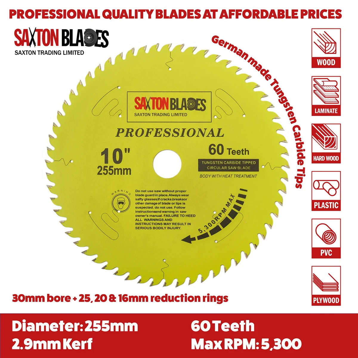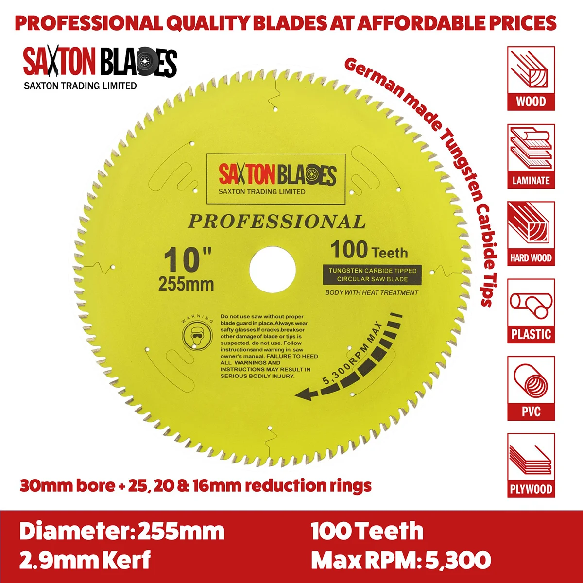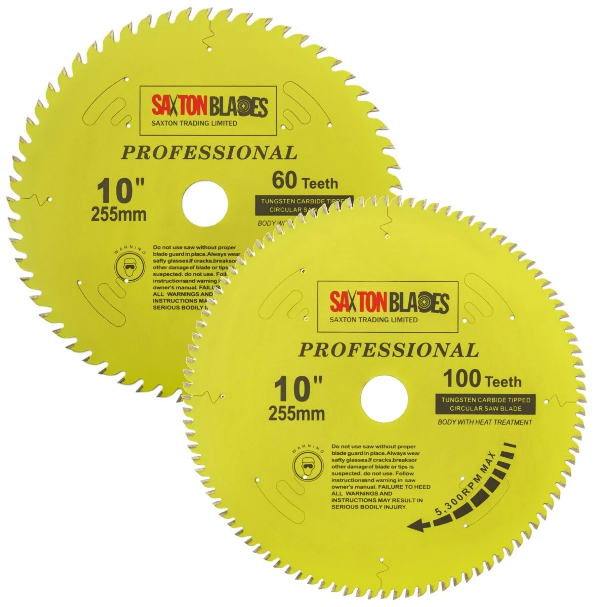 - [DIMENSIONS] - 255mm Diameter – 60 & 100 teeth - 30mm bore (16, 20, 25 & 25.4mm reduction rings included) – 2.9mm Kerf (thickness of cut) – Pack of 2